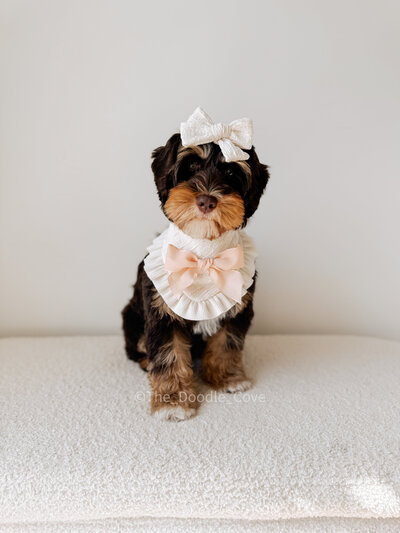 Oscar is a small medium, multigen Australian labradoodle (ALD) from Bunji Australian Labradoodles. He is a chocolate phantom parti color with a straight fleece coat. He is WALA registered. He weighs 31lbs. Thank you to our wonderful friend Jen from Bunji Doodles for allowing us to use Oscar!